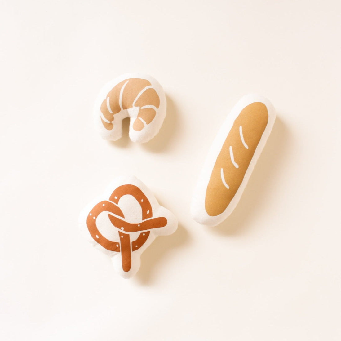 Our bread set comes with three plush mini pillows: a pretzel, a croissant, and a baguette. Made by empowered artisans in Kenya.