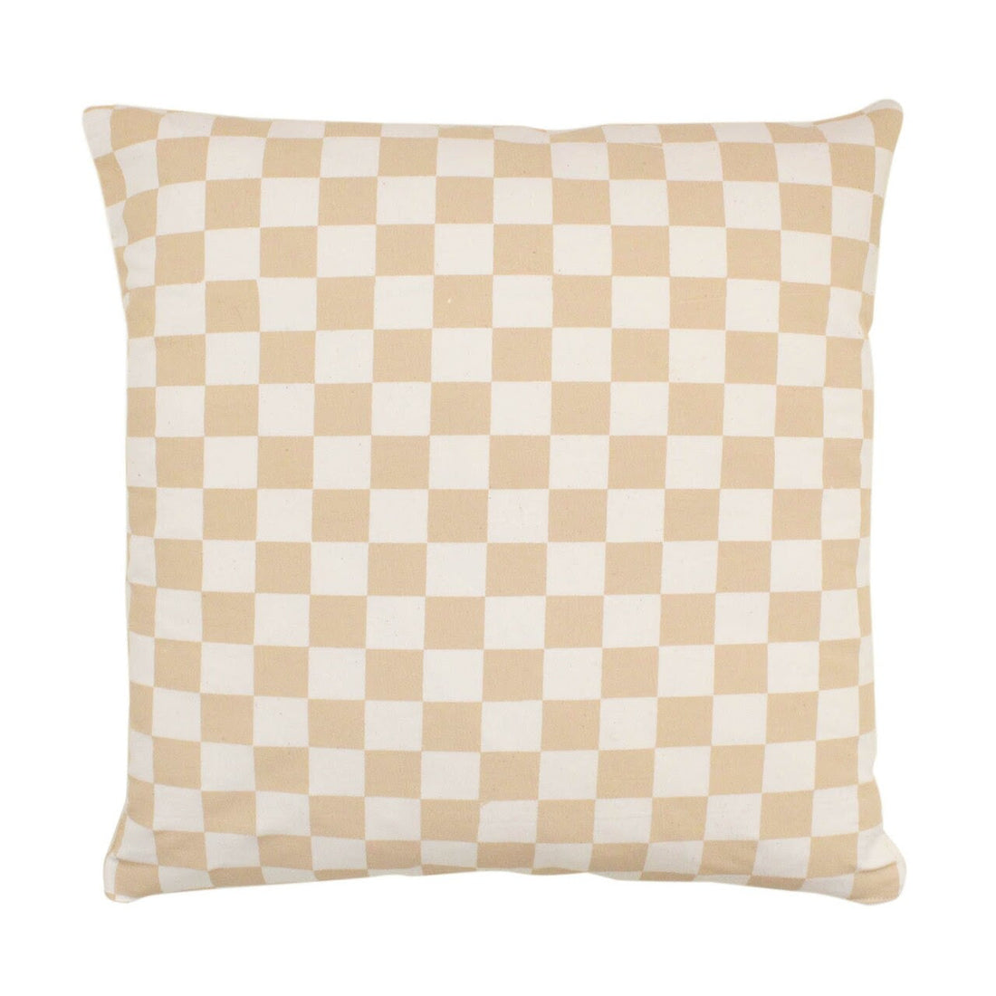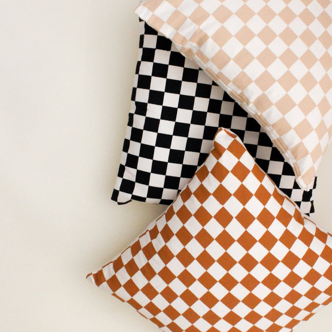 A classic 90's throwback! This canvas checkered pillow cover is double sided with an easy zipper along one side for an 18" x 18" pillow insert. Comes in three color ways - taupe, rust, and black. Made with soft canvas and screen printed by empowered artisans in Mombasa, Kenya.