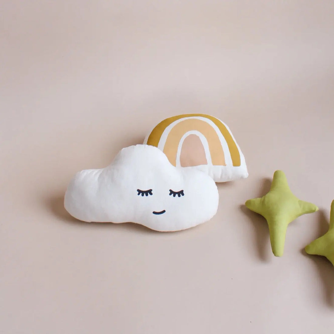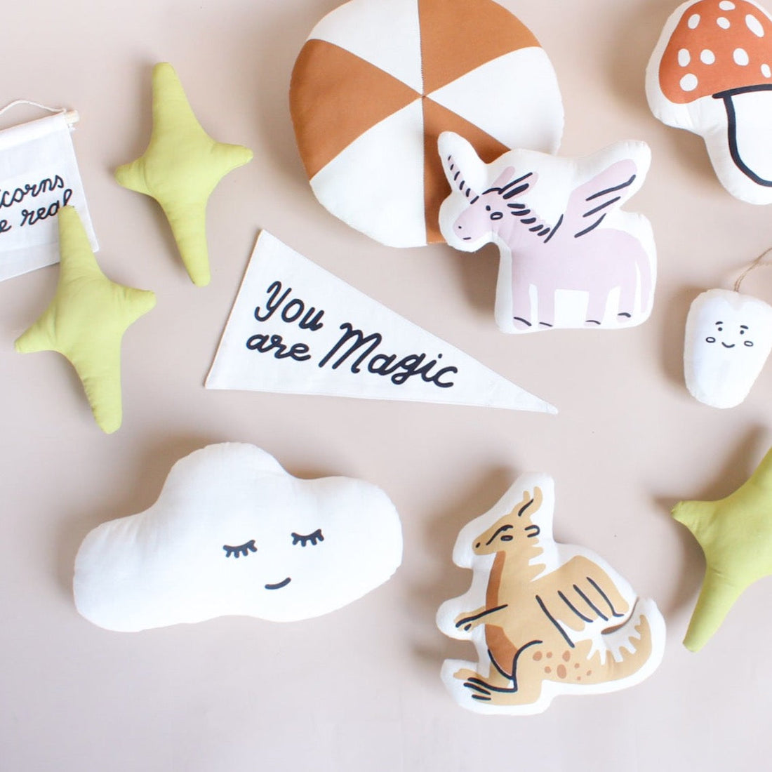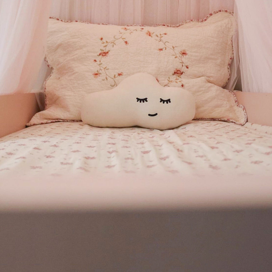 Whimsical cloud pillow with sleepy face. Sewn and screen printed by hand on natural canvas by local artisans.
