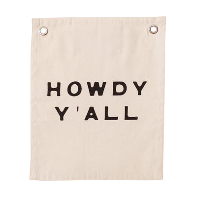 "howdy y'all" Small Banner. Sewn and screen printed by hand on natural canvas by Kenyan artisans.