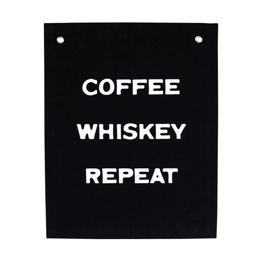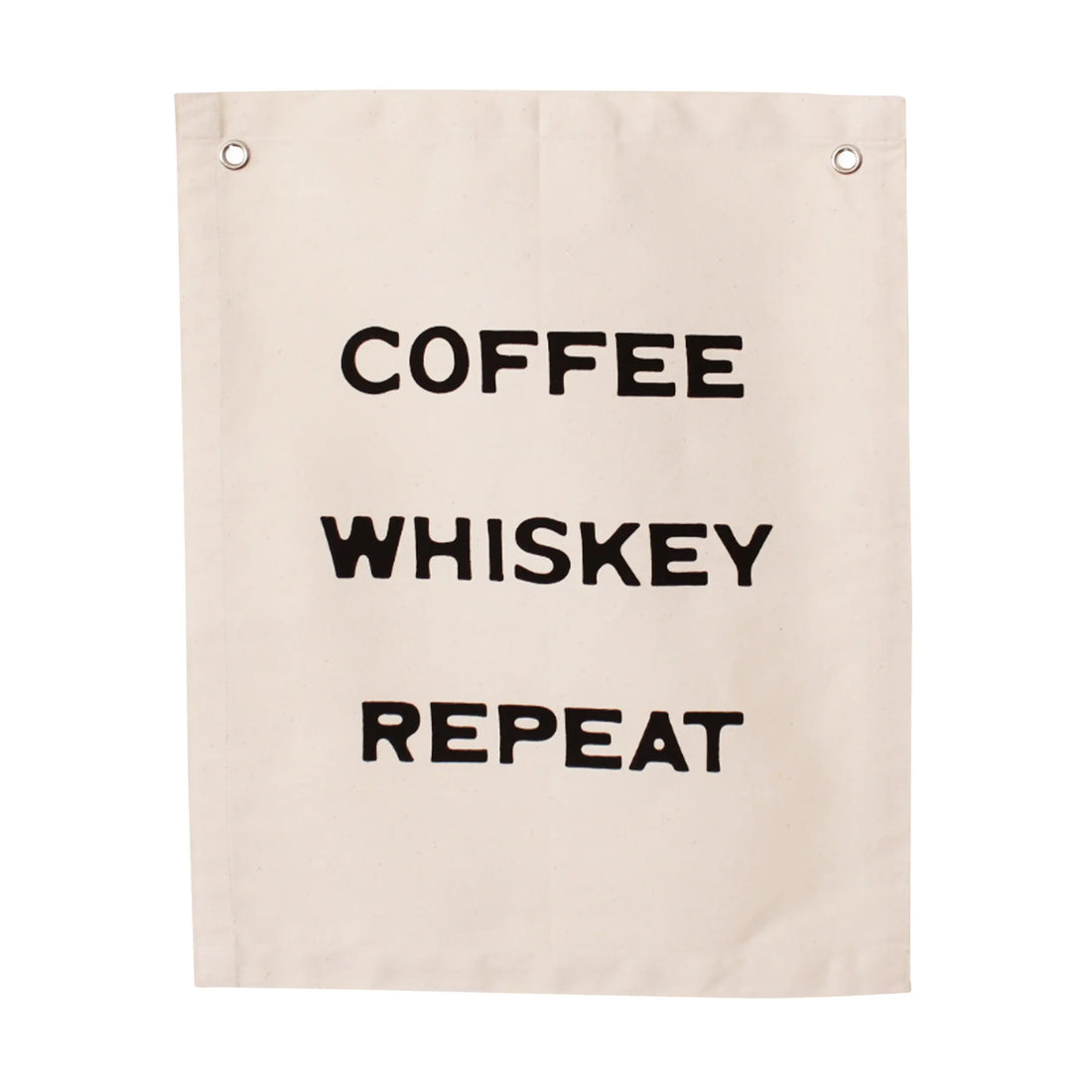 "Coffee Whiskey Repeat" Small Banner. Sewn and screen printed by hand on natural canvas by Kenyan artisans.