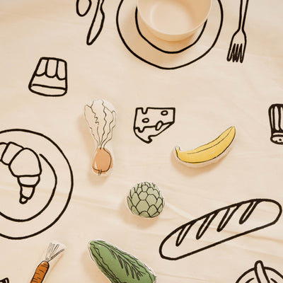 Our dinner party table setting is not only made to go well in any space but also provides a perfect backdrop for hours of open-ended play for your little ones. You can conveniently roll it up and take it with you with sewn in ties. Sewn and screen printed by hand on natural canvas by empowered artisans in Mombasa, Kenya.