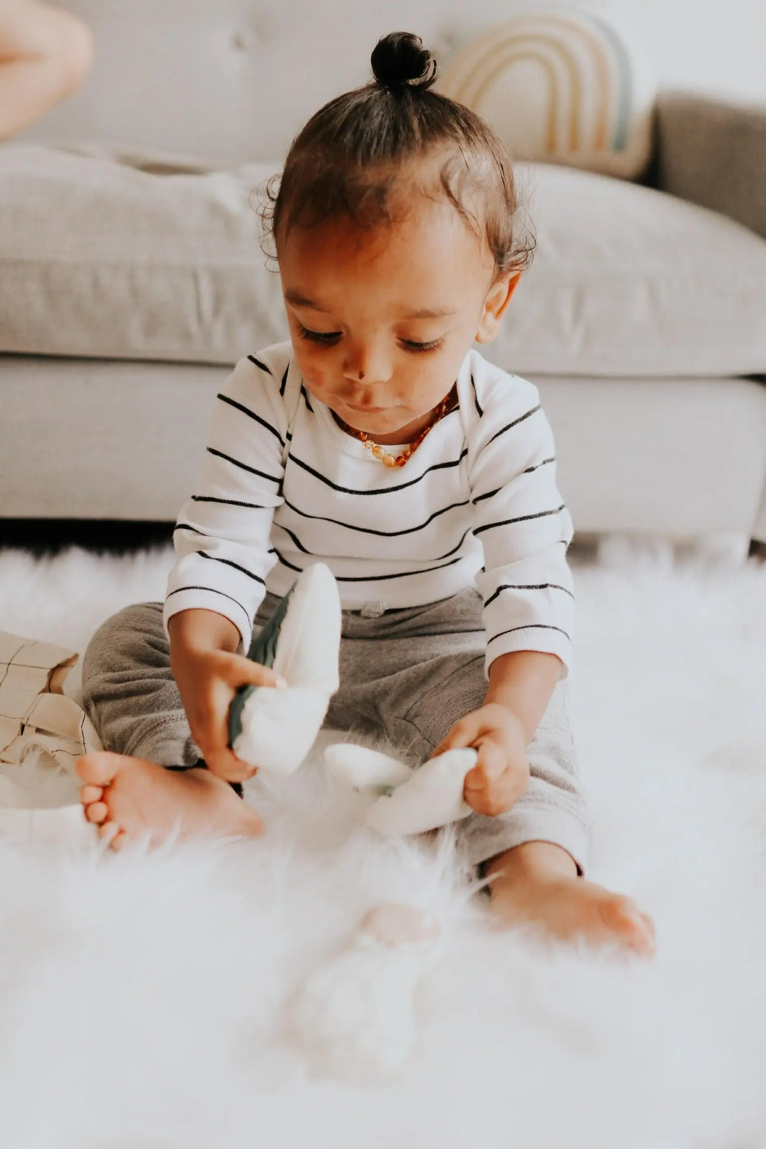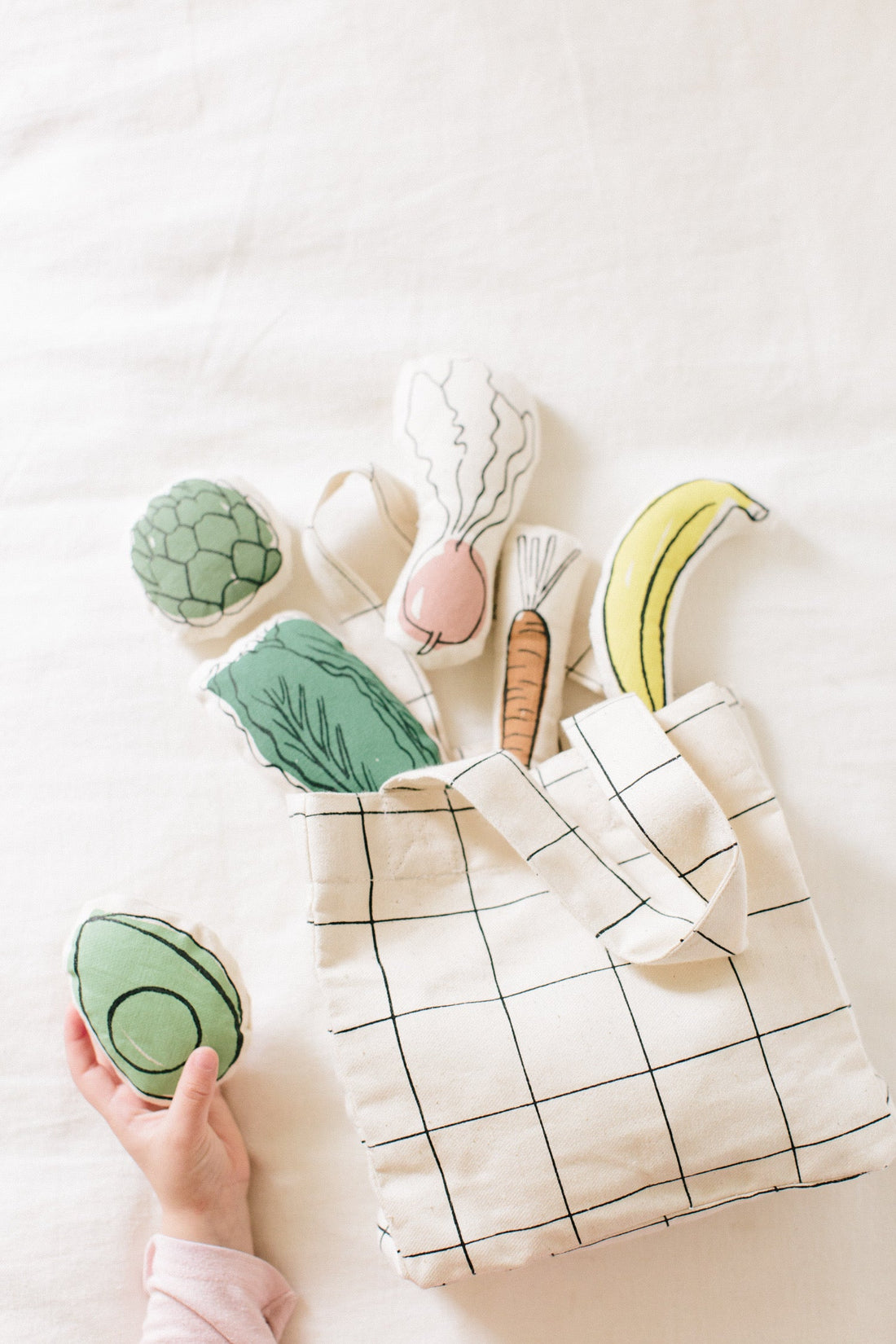 Perfect for imaginative play, our farmers market tote is a great size for little hands and includes 6 hand sewn fruits + veggies. Sewn and screen printed by hand on natural canvas by local artisans.