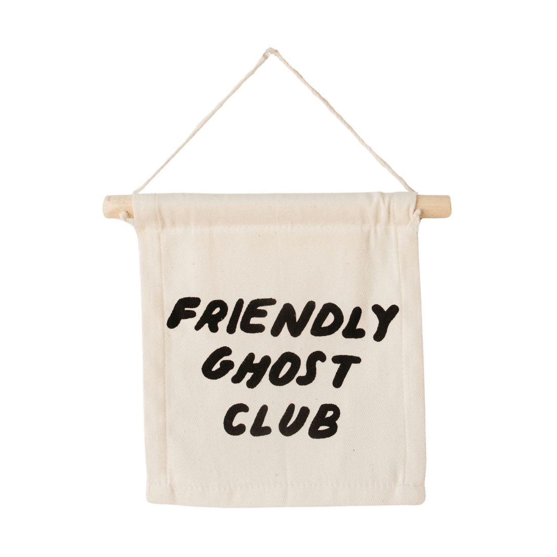 "friendly ghost club" hang sign on natural canvas with a poplar wooden dowel.