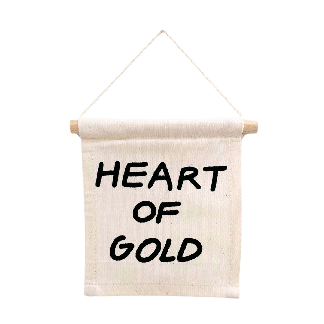 "Heart of Gold" hang sign on natural canvas with a poplar wooden dowel.