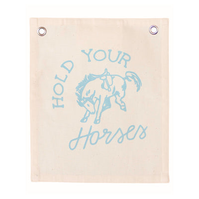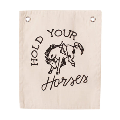 "Hold Your Horses" Small Banner. Sewn and screen printed by hand on natural canvas by Kenyan artisans.