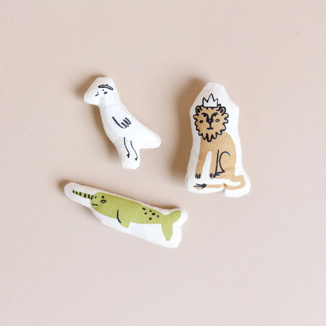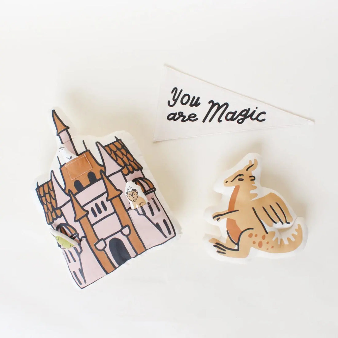 Our Interactive Castle Pillow is a soft canvas, screen printed pillow with three pockets. It comes with three mini plush characters to join your little ones on their imaginative quests: a goose in a beret, a lion in a crown, and a narwhal. Each piece is sewn and screen printed by hand on natural canvas by local artisans.
