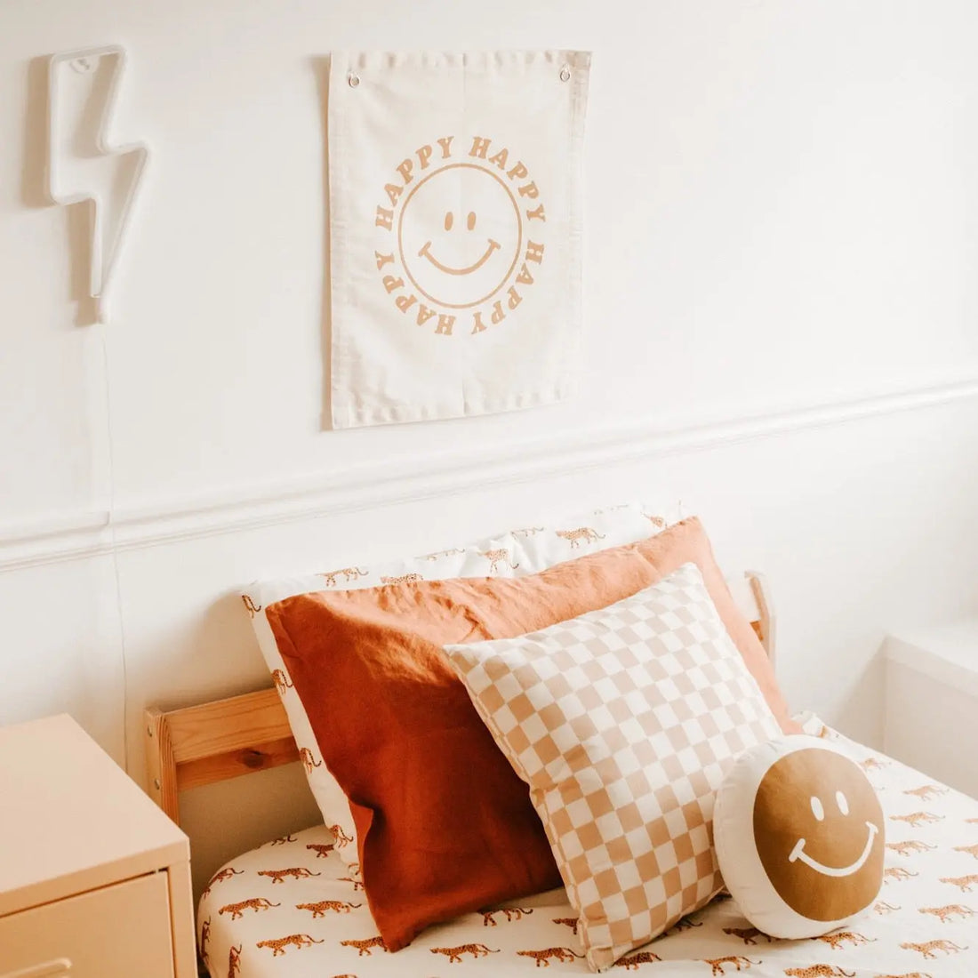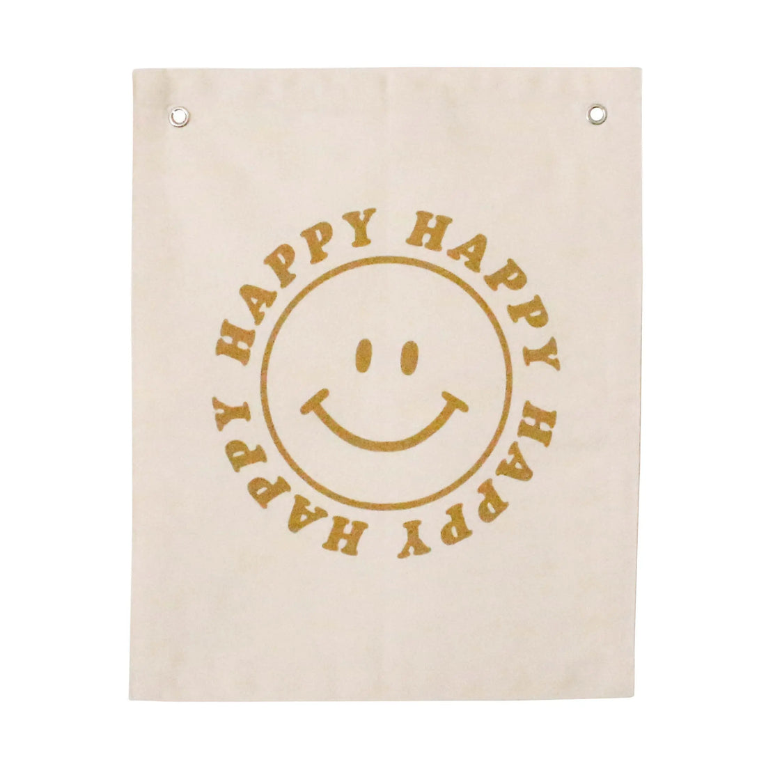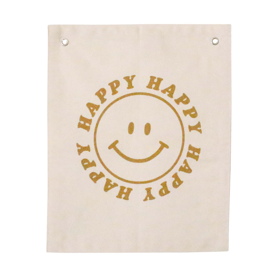 Happy smiley face banner in gold screen print | Canvas Wall Flag.