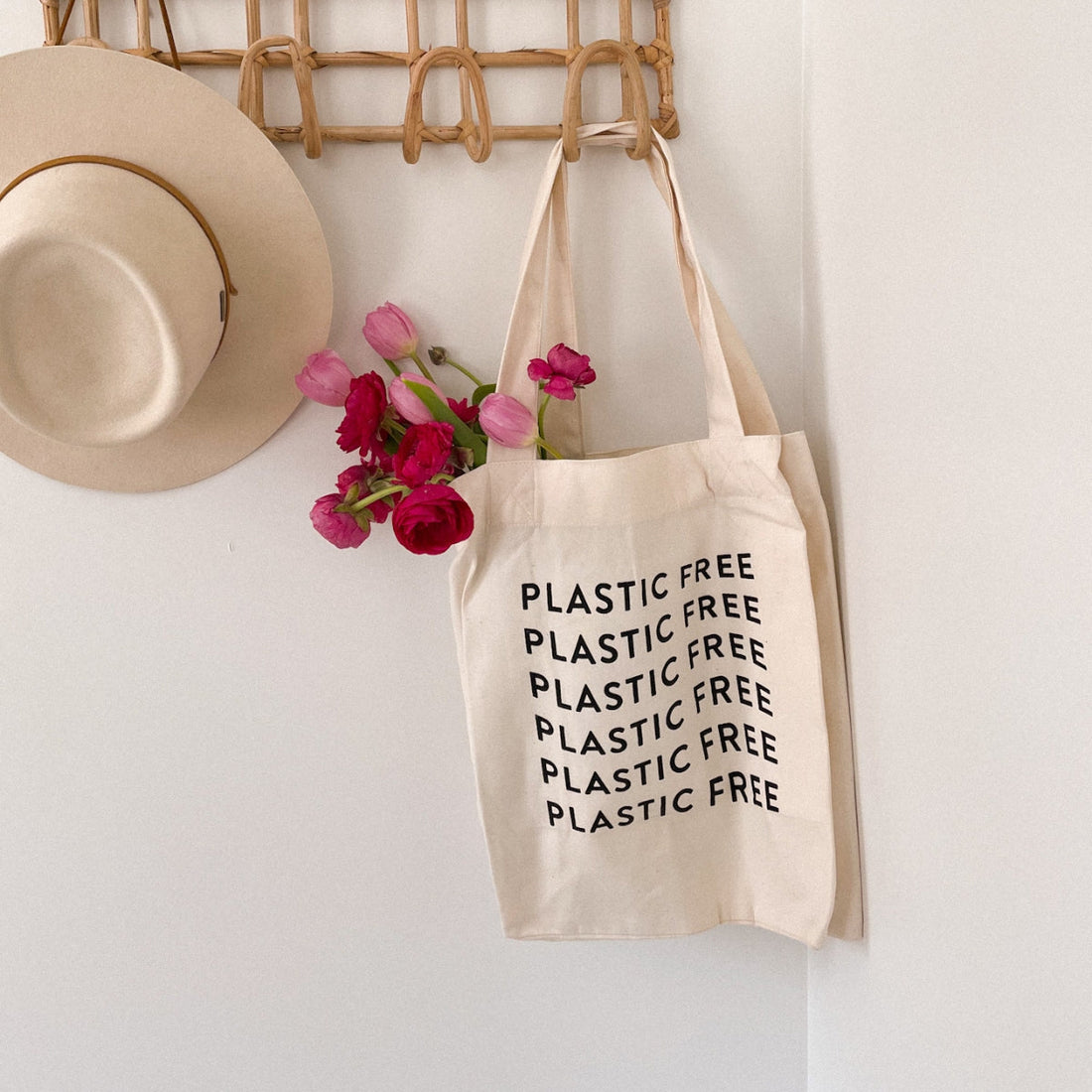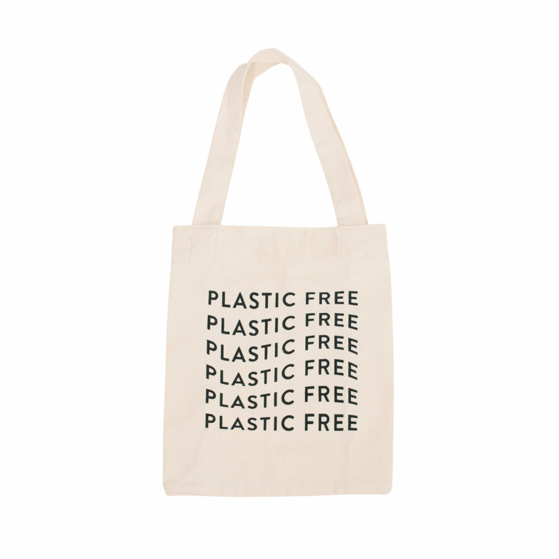 "Plastic Free" Canvas Tote - Our Plastic Free tote has an inside pocket and says "Shop Sustainably" on the back.