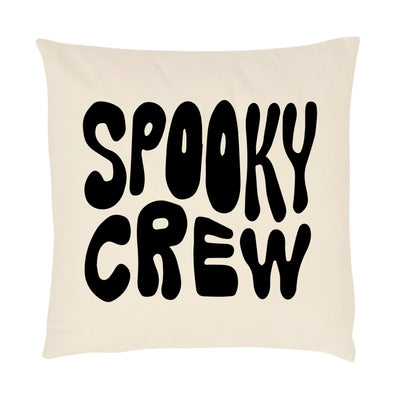 Natural canvas pillow cover screen printed with an black "Spooky Crew" design. Has an easy, invisible zipper down one side for an 18in x 18in pillow insert. Made by empowered artisans in Mombasa, Kenya.