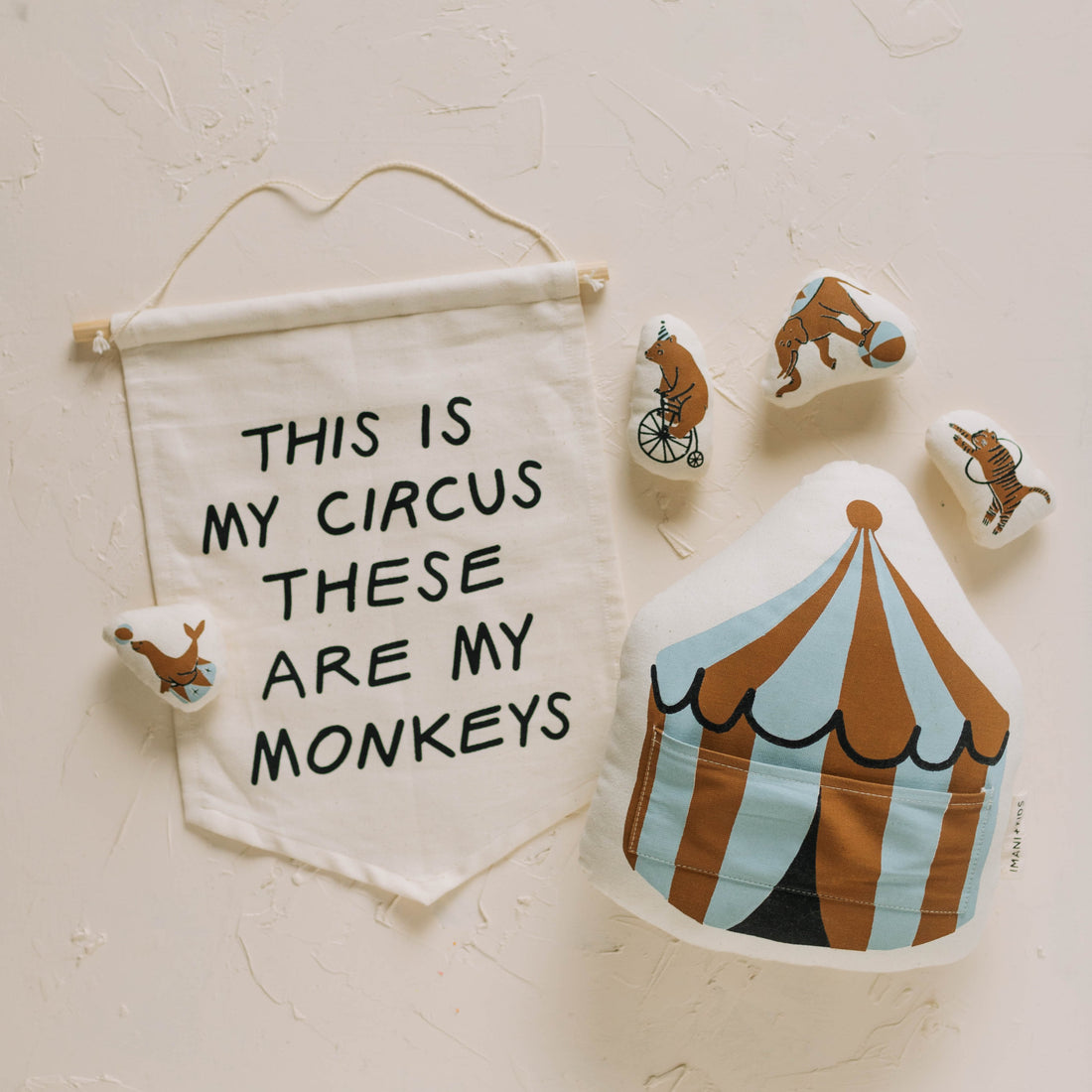 This is my circus on natural canvas hang sign with a wooden dowel.