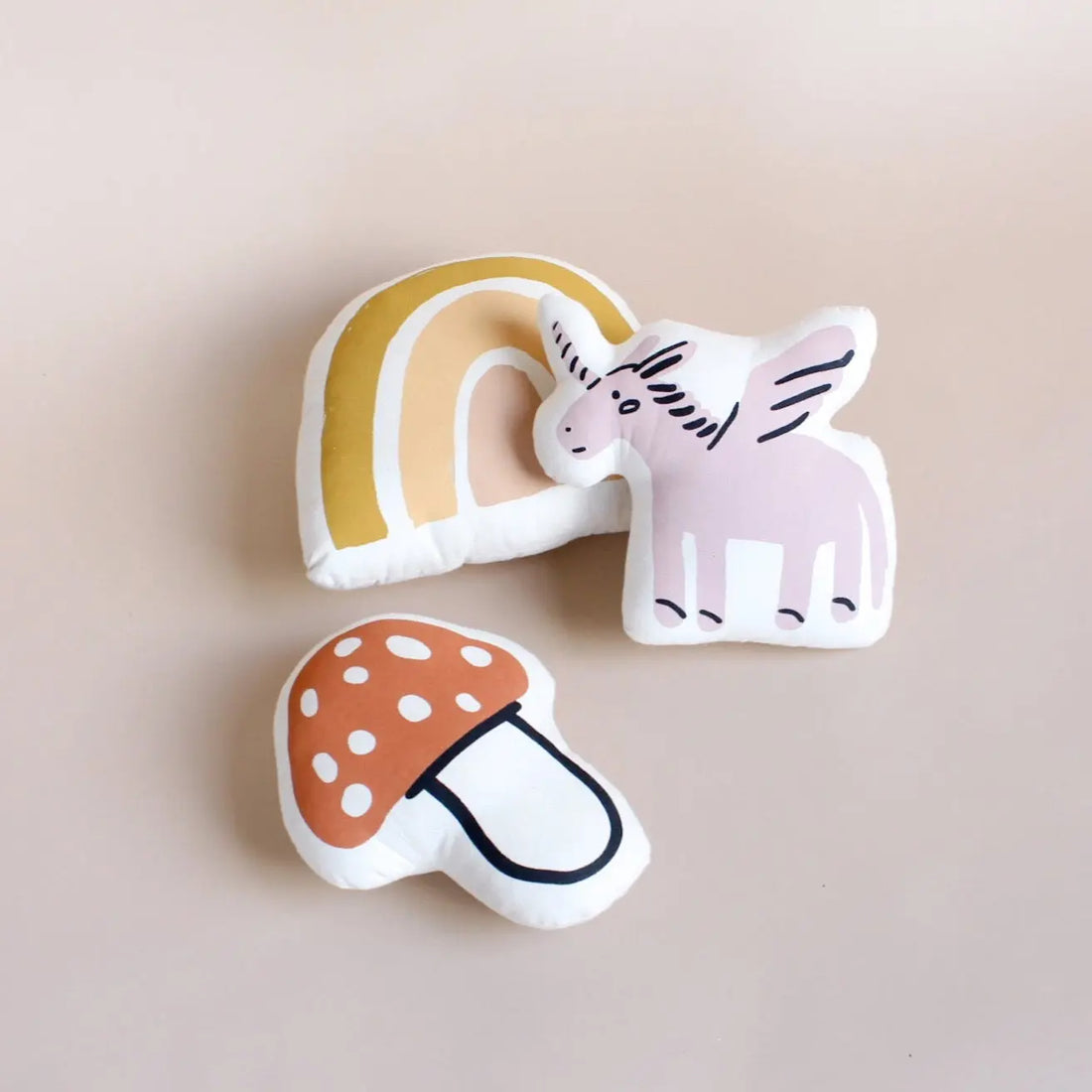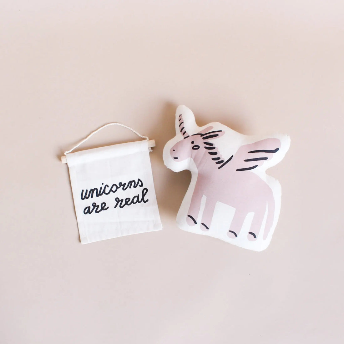 Unicorn Pillow. Sewn and screen printed by hand on natural canvas by local artisans.