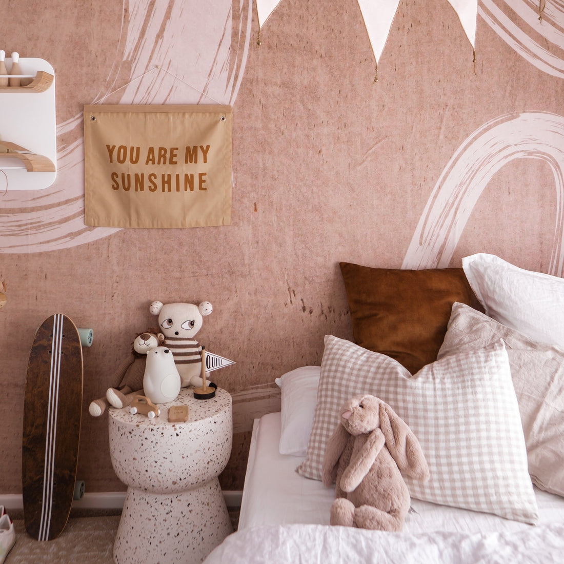 Sewn and screen printed by hand on peach cotton by Kenyan artisans.